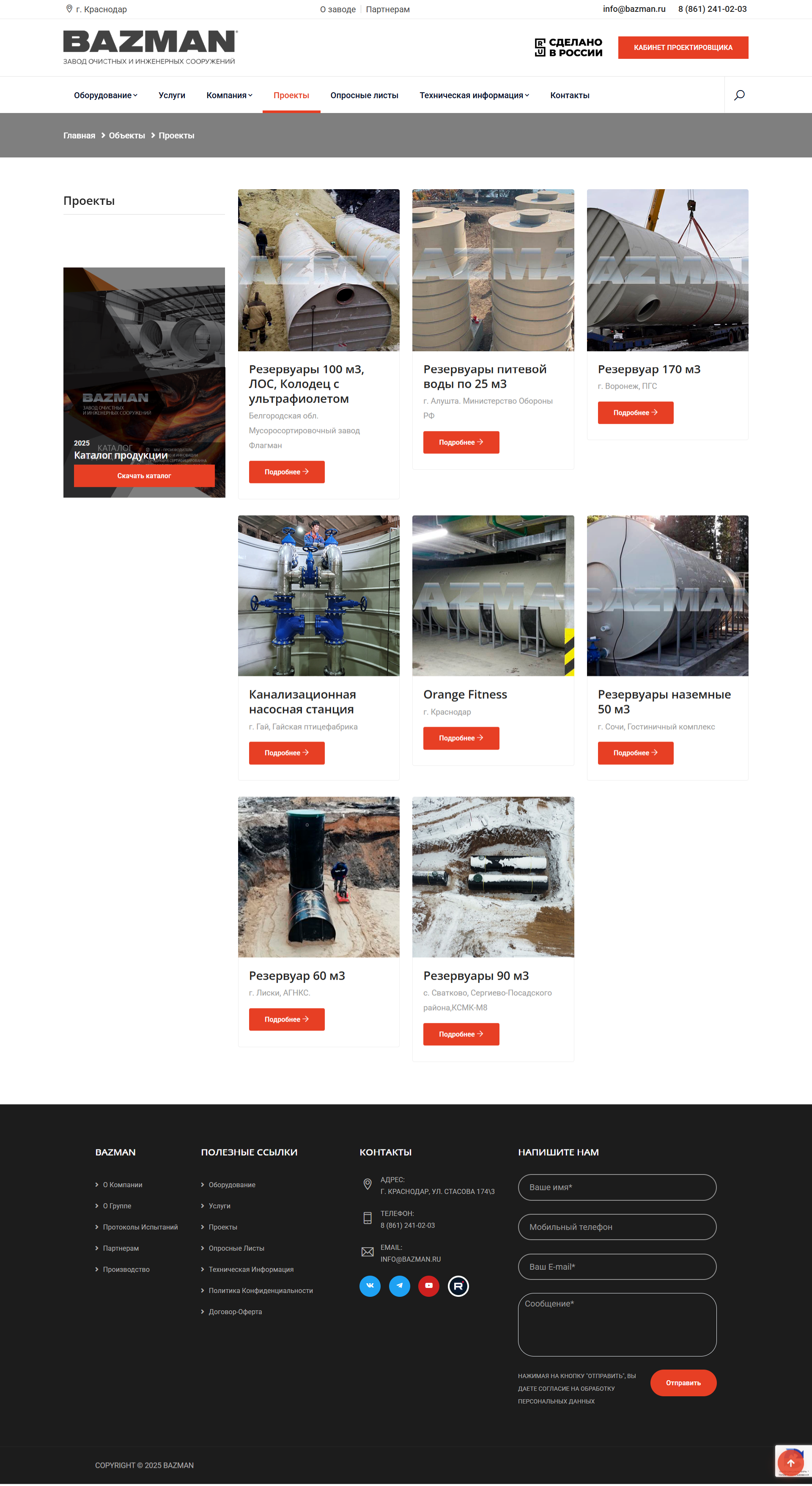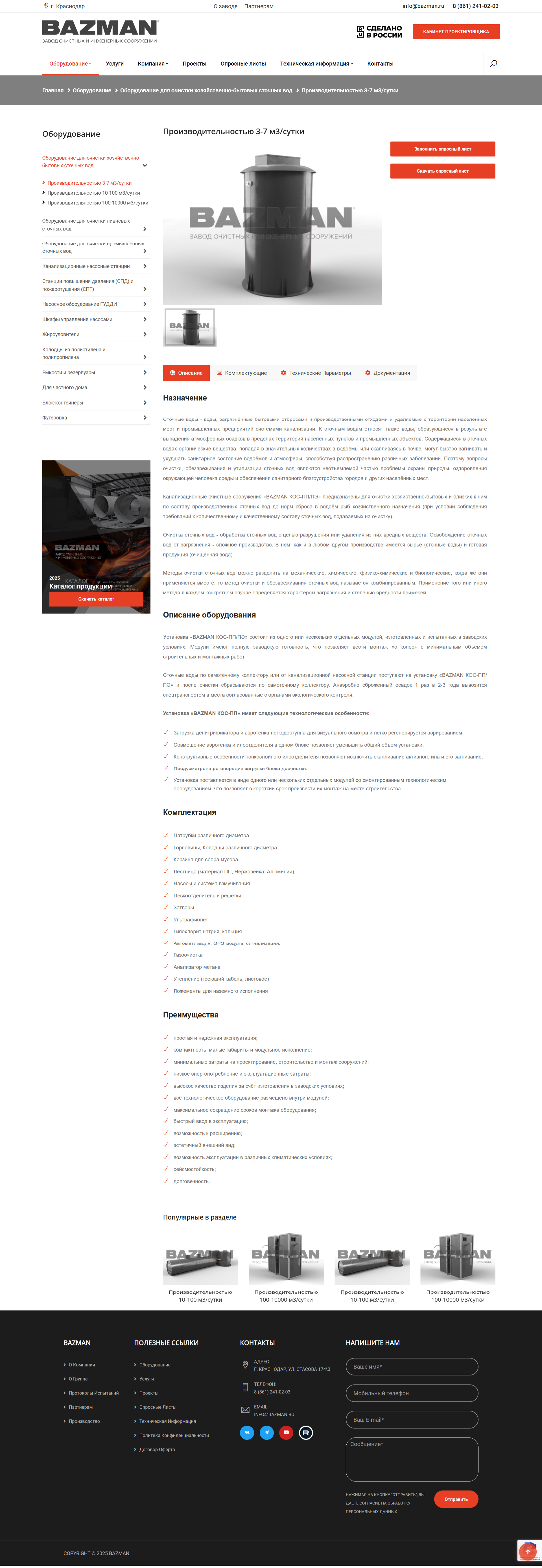 Реализован удобный каталог продукции, подробными характеристиками и возможностью запросить и скачать опросные листы. Добавлены разделы о компании, производстве, проектах и сертификации. Интегрированы формы обратной связи, заявок и быстрой коммуникации с клиентами.