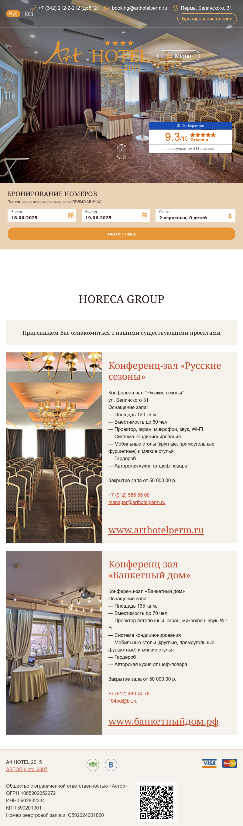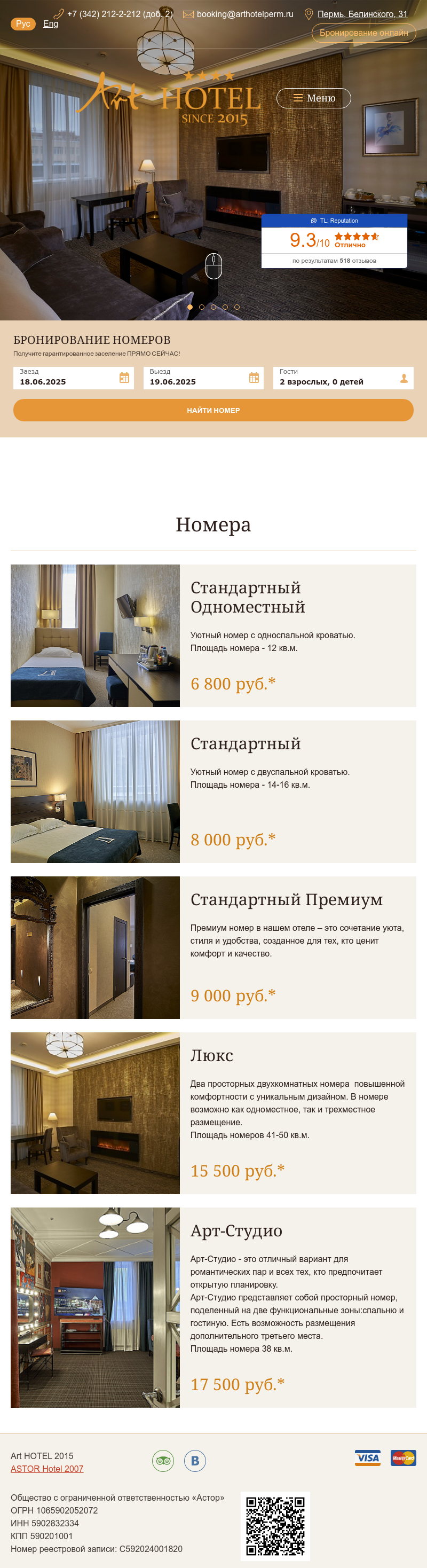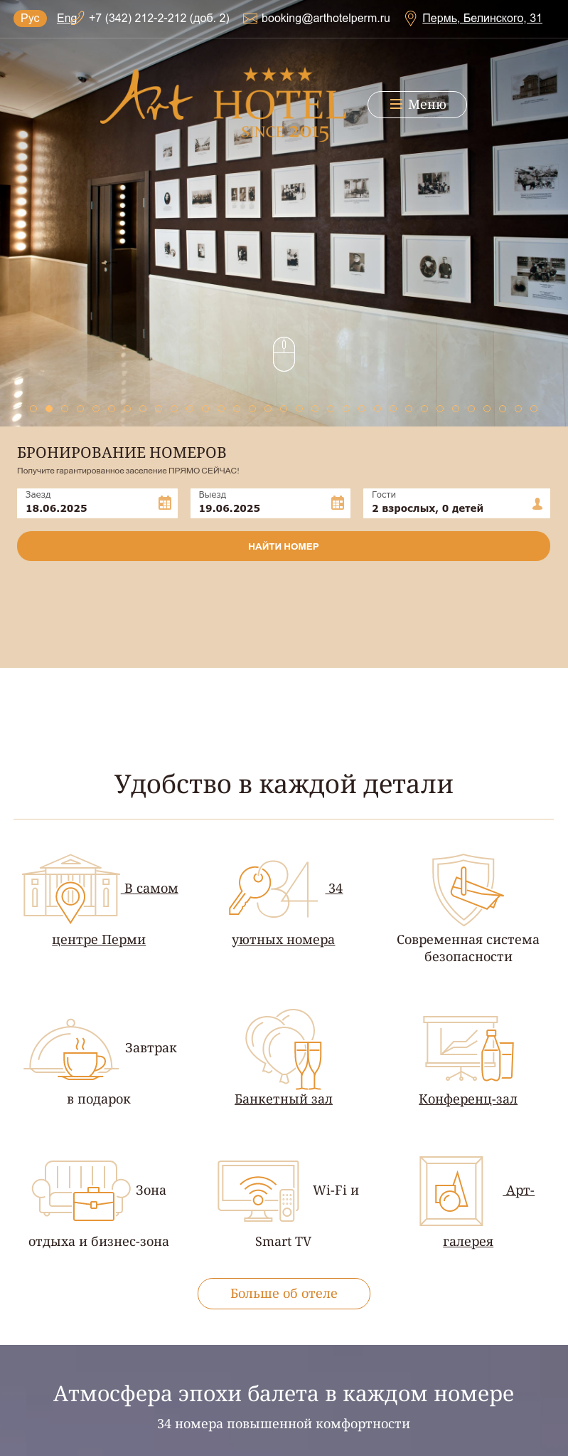 Art Hotel Perm — полноценный корпоративный сайт гостиницы, разработанный нашей командой на платформе «1С-Битрикс: Управление сайтом».